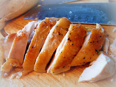 I'm still working on my "removing bones from chicken skills"-- but I managed to cut out the breast bone and then I sliced the chicken breasts. Melissa was right-- I had four generous portions.