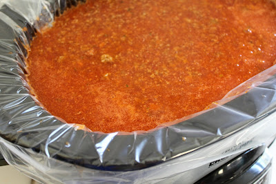 Transfer mixture to slow cooker, cover, set temperature to high, and bring to boil. I love the slow cooker bags that I find at my grocery store. They really do make cleanup much easier! We're cooking this on HIGH, bringing it to a boil. Why? According to the Cook's Country article, we want the extra liquid to evaporate, so we don't get a watery sauce.